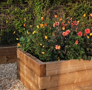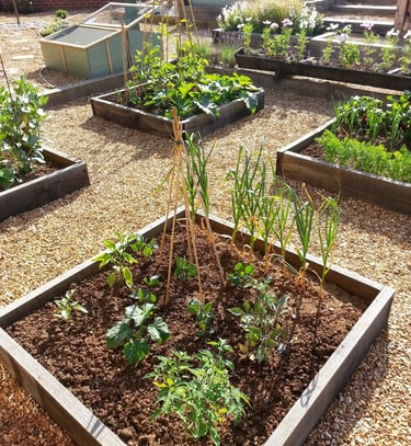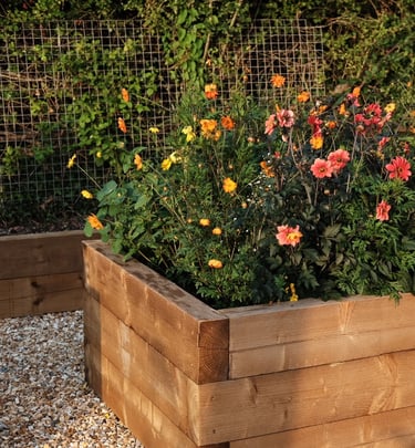 Add raised beds to create areas where you can control and optimise veg growing. Children can also 'own' these to create their own micro gardens.